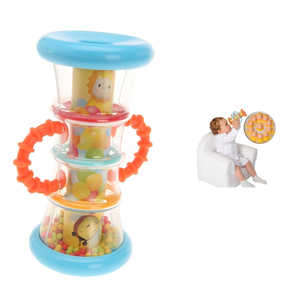 Un juguete divertido que enseña al bebé a descubrir lo desconocido. Estimula la parte auditiva y visual con este caleidoscopio, ya que, al movimiento genera sonido, gracias a las pelotitas en su interior. Complementa la parte visual, con la experimentación y el descubrimiento del universo de colores que conocerá el bebé al ver en su superior. Este producto no requiere el uso de pilas. Medidas: 15x9x9 cms.