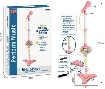 Hermoso micrófono con amplificador , puedes conectar tu MP3 o teléfono para cantar, altura regulable . Medidas 85x23 cms. Requiere 3 pilas AA incluidas.