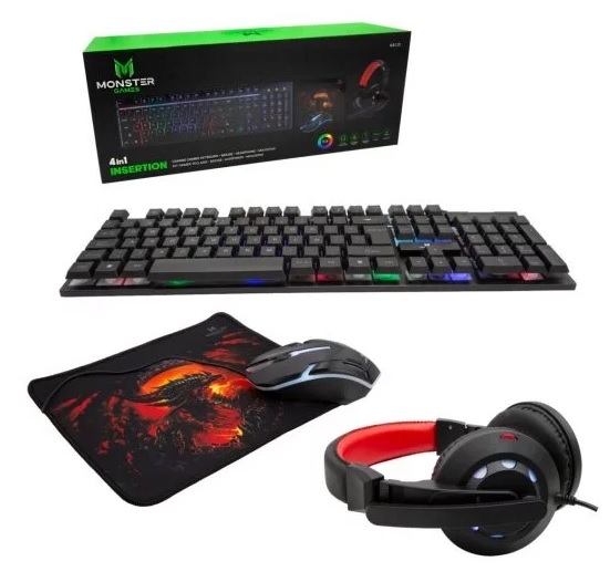 Kit Gamer Monster 4 en 1,¡Accesorios Gamers facinantes para el Gamer del futuro! Modelo detallado: K4125 Modelo del teclado: k4125 Color de la retroiluminación del teclado: RGB Color de la retroiluminación del mouse: RGB Tipo de sensor del mouse: Óptico Resolución del sensor del mouse: 1000 dpi Descripción TECLADO usb 2.0 104 teclas, incluye letra ñ dimensiones 442 x 135 x 30 mm MOUSE Usb 2.0 dimensiones 126 x 70 x 41 mm 3 botones 1.4 mts de cable 1.000 Dpi PADMOUSE dimensiones 250 x 210 x 2 mm AUDIFONO Altavoz 40mm impedancia 32 +/- 15% sensibilidad 108<> 3db respuesta de frecuencia 20Hz a 20Khz longitud del cable 1.8 mts conector independiente audio y micrófono usb para iluminación.