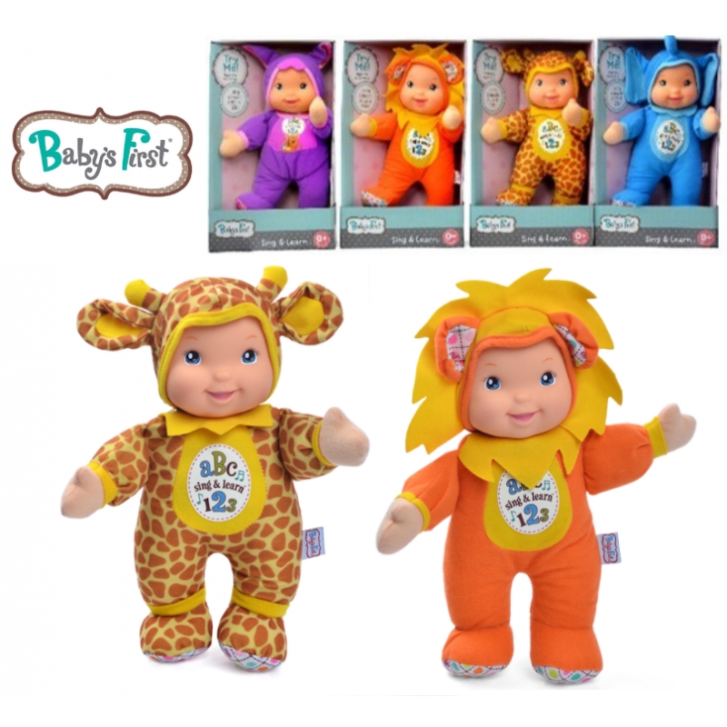 Baby´s First Muñecas Canta y Aprende, Las muñecas canta y aprende de Baby´s First hace que el aprendizaje sea más divertido y rápido cuando se introduce la música. Presione la barriga de la muñeca y contará del 1 al 10, presiona otra vez y podrás escuchar el abecedario. Imagen Referencial usted al seleccionar este código recibirá una versión según disponibilidad. Medidas: 34 cm. Este juguete incluye pilas.