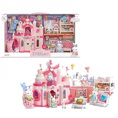 Castillo de la Familia Conejo, Haz volar la imaginación de los niños con este encantador castillo rosa de ensueño, lleno de detalles mágicos y accesorios que invitan a horas de diversión. Con un diseño inspirado en un palacio de fantasía, incluye múltiples habitaciones, muebles en miniatura y adorables figuras de conejitos que permiten recrear historias llenas de ternura. Su estructura combina torres, balcones, un molino decorativo y escaleras, creando un ambiente de cuento de hadas perfecto para el juego creativo. Medidas: 59x32x19cm. Este regalo no requiere pilas.