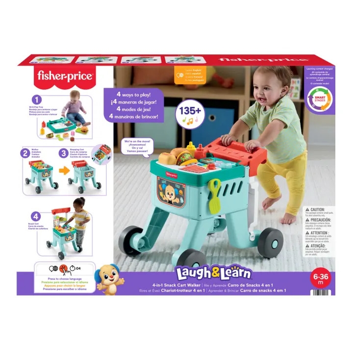La Andadera Carro de Snacks 4 en 1 de Fisher-Price mantiene la diversión en movimiento mientras tu bebé crece, desde que se sienta hasta que camina y empieza a jugar a imaginar deliciosas (y educativas) situaciones. Este andador de empuje y juguete de actividades se transforma fácilmente en 4 formas de juego: actividades para jugar sentado en el piso, empujar y caminar, carrito de compras y juego de rol de cocinar y servir alimentos. Incluye 14 piezas de juego removibles y 3 niveles de aprendizaje Smart Stages que se adaptan al crecimiento del bebé, ofreciendo múltiples formas de juego interactivo. Usa el botón del globo para seleccionar el idioma: inglés, español, francés o portugués brasileño. Los colores y decoraciones pueden variar. Requiere 3 pilas AA