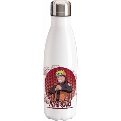 Con unas medidas de 24,2x6x6 cm y un peso ligero de 127 gramos, es perfecta para llevar a cualquier parte. Su diseño presenta a Naruto, en un fondo rojo con detalles de nubes, evocando el icónico estilo visual del anime. La tapa metálica añade un toque de elegancia y asegura un cierre hermético.
