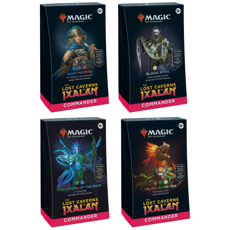 En Las Cavernas Perdidas de Ixalan, tus jugadores vivirán una aventura sin precedentes, descubriendo ruinas olvidadas, civilizaciones antiguas aún vivas y criaturas favoritas de los fans campando a sus anchas. Adéntrate en el corazón de Ixalan con una pieza de prehistoria para cada estilo de juego. En Commander, cuatro jugadores se unen para demostrar su fuerza y estrategia, y solo uno se alzará con la victoria. Cada mazo de Commander de 100 cartas, listo para jugar, de Las Cavernas Perdidas de Ixalan, facilita a los aficionados de Commander de tu tienda la adquisición de un mazo y la entrada en acción.