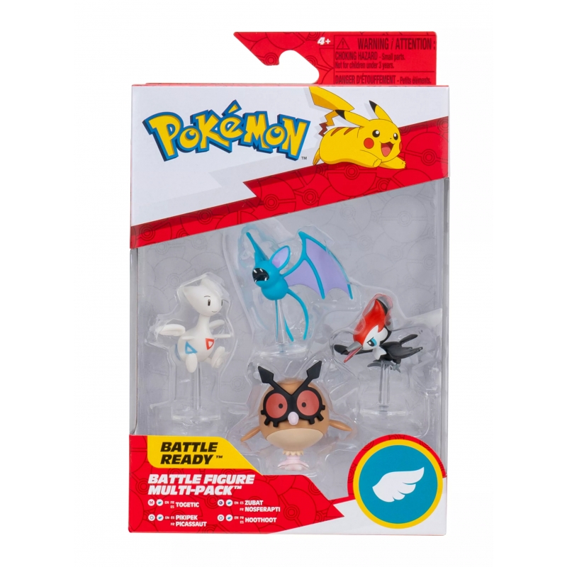 Desata el poder del vuelo con el pack de 4 figuras de batalla Pokémon. Entrena con Togetic y Hoothoot de 5 cm antes de unirte a Pikipek y Zubat, también de 5 cm. Todos los Pokémon de 5 cm caben en el set de juego Clip 'N' Go Poké Ball y estuche. Estas figuras, con un gran nivel de detalle, parecen salidas de la serie animada Pokémon.