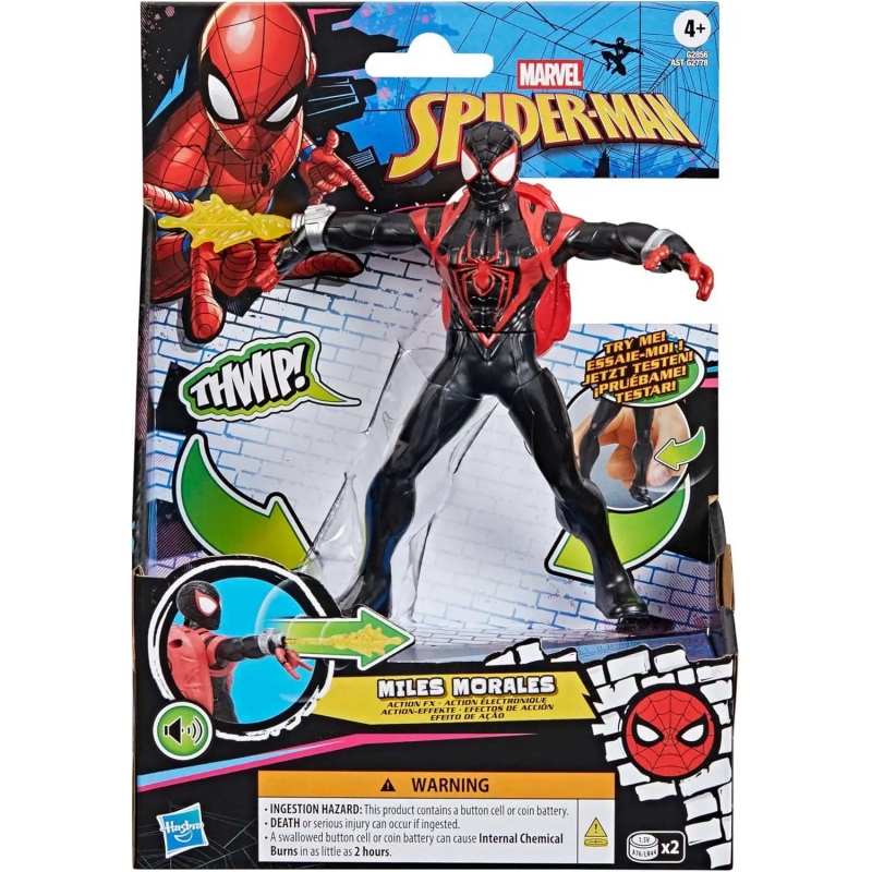 ¡Imagina acción trepidante con esta figura Action FX de Miles Morales de Marvel Spider-Man de Hasbro! Este juguete de 15 cm presenta el clásico traje negro y rojo, inspirado en los cómics de Marvel, e incluye 6 efectos de sonido únicos. Para activar la función Action FX, simplemente aprieta las piernas de la figura, girando a Miles por la cintura mientras lanza una telaraña retráctil, ¡acompañado de efectos de sonido!