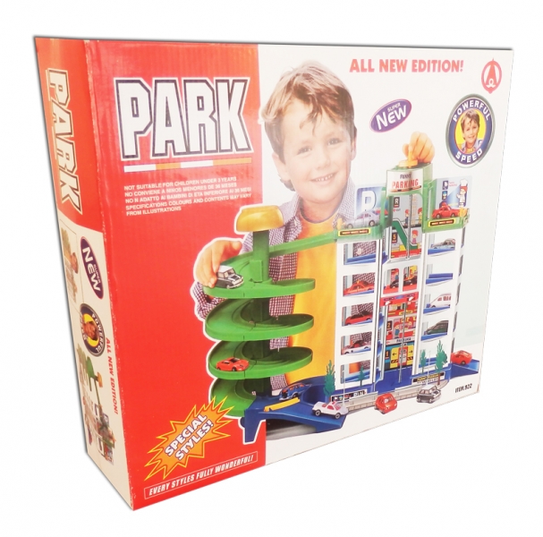 Maneja por intermedio de las pistas los autos incluidos en el set y estaciona en los diferentes niveles de este moderno estacionamiento.