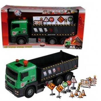 El camión volquete de acción de bomba Dickie Toys Majorette con accesorios es un juguete de 21.5 con una función especial de bomba de aire que sube y baja el volquete Este vehículo incluye señales, barricadas y conos de obras viales, todo en colores brillantes que atraen y atraen la atención de los niños.
