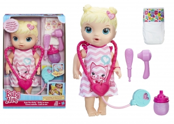 La bebé Tiernos Cuidados está enferma y necesita alguien que la cuide. Hazle un chequeo para ver qué le pasa. Viene con todo lo que necesitas para cuidar de ella, como un termómetro y un estetoscopio de juguete. Dale su biberón y luego cámbiale el pañal. Cuidar de la bebé cuando está enferma no es fácil, pero con una mami tan cariñosa como tú, ¡ella se curará muy pronto!. Medidas de la muñeca: 31x13x9 cms.