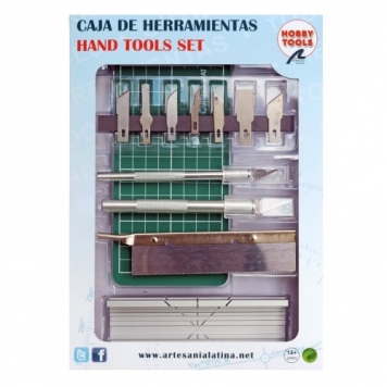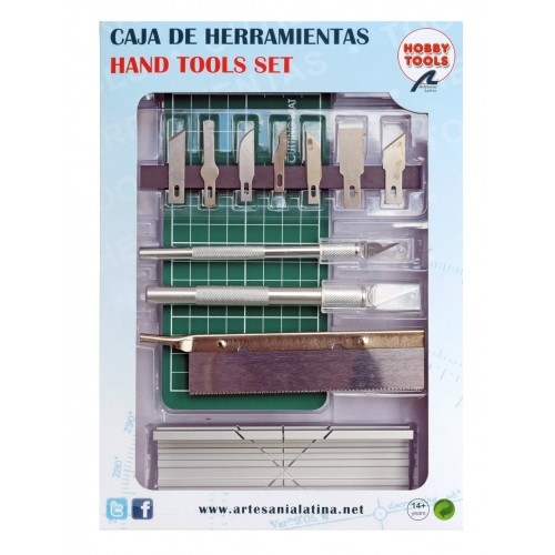 El set incluye; 2 cutter con 7 cuchillas de recambio de diferentes formas aptas para ambos cutter, barra magnética para las cuchillas, tapete de corte, serrucho de modelismo y caja de ingletes.