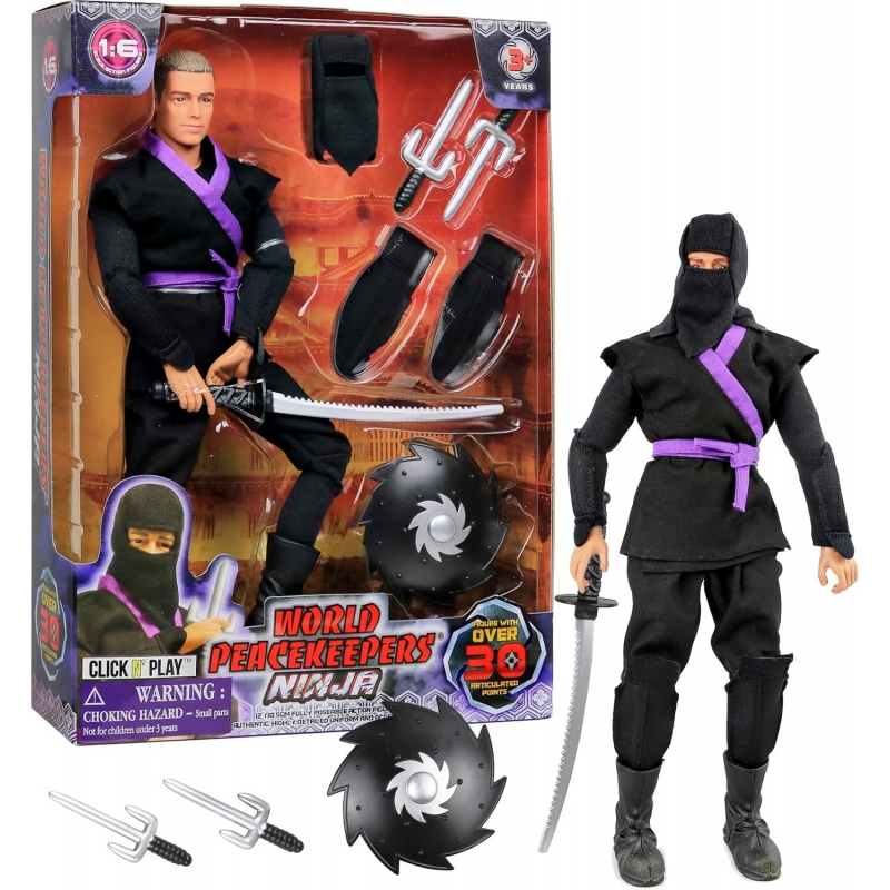Click N' Play Figura de acción Ninja, Alimenta la creatividad de tu hijo con horas de juego cautivador. Este set no solo potencia la imaginación, sino que también ofrece una forma estimulante de mantenerlo entretenido. Figura de acción totalmente articulada de 30 cm a escala 1:18 que se sostiene de pie gracias a sus 30 puntos de articulación. Un set fantástico para potenciar la imaginación de tu hijo y mantenerlo ocupado durante horas, además de ser una gran adición a otros sets de figuras de acción. Medidas: 32x7x22 cm. Este regalo no requiere pilas.