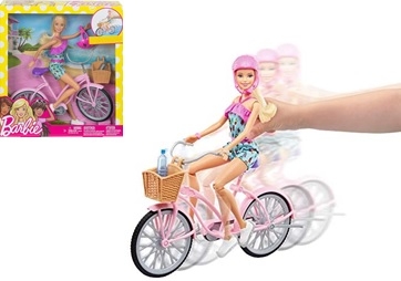 ¡Con Barbie, la imaginación de las niñas se pone en marcha gracias a la preciosa bici que la muñeca puede montar de verdad! De color rosa y detalles plateados, esta bici con cesta y sillín morado consigue despertar la imaginación para contar todo tipo de historias. Para darle más diversión al juego, la muñeca Barbie se ajusta al sillín de la bici. El clip del asiento sujeta la espalda de la muñeca, sus manos se ajustan al manillar y sus pies encajan en los pedales. Dale un empujón a la bici para poner en marcha la diversión: las piernas de Barbie tienen articulaciones en la cintura y las rodillas para que sus pies se muevan con los pedales mientras las ruedas giran. ¡Hay un montón de lugares para visitar! ¡Barbie luce un conjunto perfecto para divertirse por el camino! La muñeca luce un mono con volantes y un estampado de helados. Las zapatillas blancas, un reloj y un casco son los accesorios perfectos para ir en bici con seguridad. Además, la botella de agua, que cabe en la cesta, consigue poner en marcha la imaginación para contar todo tipo de historias