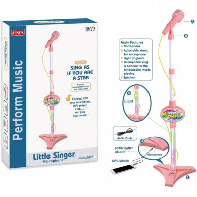 Hermoso micrófono con amplificador , puedes conectar tu MP3 o teléfono para cantar, altura regulable . Medidas 85x23 cms. Requiere 3 pilas AA incluidas.