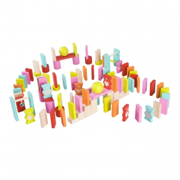 Los niños apilan bloques de dominó para ayudar al oso a enviar su mensaje de amistad. Trabajar con bloques de dominó ayuda a los niños a mejorar la capacidad de enfoque, la coordinación y la imaginación.