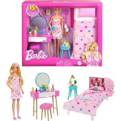 Barbie Cuarto de los Sueños, Este conjunto de dormitorio de Barbie inspirará dulces historias por la mañana y por la noche. La muñeca Barbie viene con un gatito soñoliento y 20 coloridas piezas con temática de dormitorio. Barbie está cómoda y calentita gracias a su adorable conjunto de pijama estampado y zapatillas de pelo suave. La aterciopelada bata rosa añade un toque extra de comodidad.