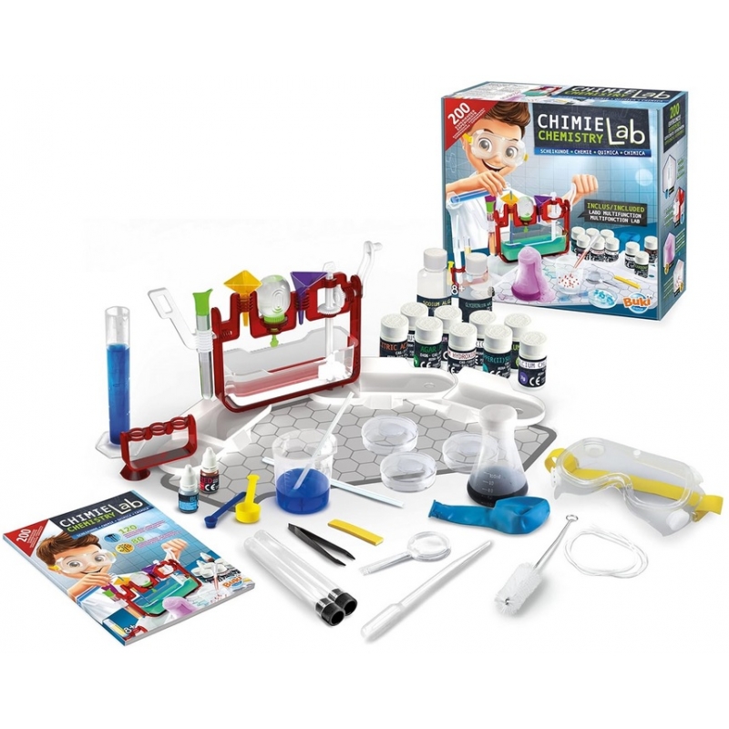 Buki Laboratorio de Quimica 200 Experimentos, Conviértete en un auténtico pequeño químico con el laboratorio que trae diferentes funciones para mezclar, verter, utilizar un cuentagotas, filtrar y transvasar las mezclas y sustancias. Este kit cuenta con accesorios y productos para hacer los 200 experimentos: probeta, tubos de ensayo, gafas de protección y los diferentes productos en polvo. Se detallan y se explican los 200 experimentos en un folleto ilustrado en color, con fotos y esquemas fáciles de entender. Medidas: 45 x 11 x 32,2cm. Este juguete no requiere pilas.