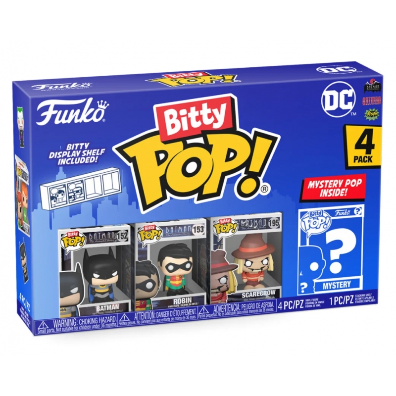 ¡Tus pops favoritos! ¡Se han reducido a Bitty Pops! ¡Amplía tu colección de DC con este surtido de Bitty Pop! ¡Figuras de tus héroes y villanos más queridos! ¡Este paquete de 4 incluye Bitty Pop! ¡Batman, Bitty Pop! ¡Robin, Bitty Pop! ¡Espantapájaros y un misterioso Bitty Pop! cifra. ¡El posible misterio Bitty Pops! son Hyper Rare (1/6) Robot Batman, Hyper Rare (1/6) Batman Beyond, Rare (1/3) Catwoman y Rare (1/3) The Penguin.