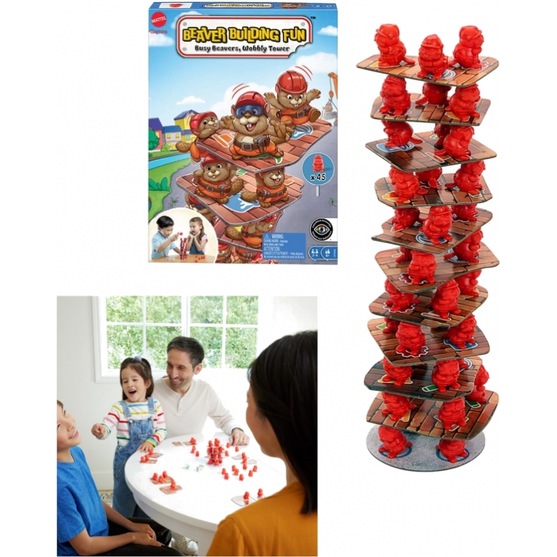 Mattel Games Juego De Mesa Beaver Building Fun, A medida que la tambaleante torre crece más y más, aumenta la tensión mientras los jugadores esperan saber quién la hará caer. Tira los dados para ver qué símbolos salen y coloca un castor en cada símbolo coincidente con las fichas de construcción. Cuando una ficha esté llena, hay que colocarla en una torre. Pero CUIDADO, si la torre se cae, ¡se acaba el juego y pierdes! ¡GANA el jugador que tenga más mano y suerte!. Medidas: 22x28x27 cm. Este regalo no requiere pilas.