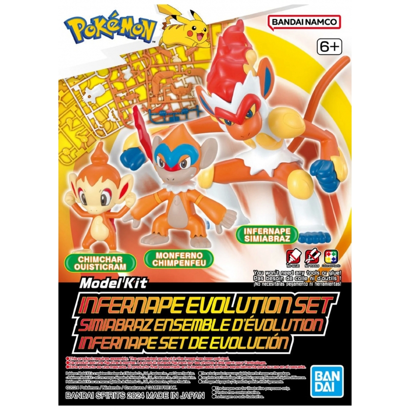 Este sencillo kit de plástico con ajuste a presión permite a los modelistas construir a Pikachu y tres formas de evolución de Infernape, que consisten en Infernape, Monferno y Chimchar.