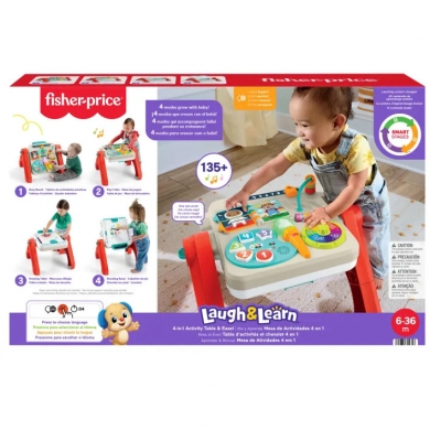La mesa de actividades y caballete 4 en 1 "Ríe y Aprende" de Fisher-Price mantiene a los pequeños entretenidos jugando y aprendiendo a medida que crecen. Este juguete interactivo de aprendizaje se transforma fácilmente de un panel a una mesa de actividades. Con infinitas oportunidades de juego, también puede ser una mesa de juego e incluso un caballete de arte. El panel cuenta con una variedad de actividades prácticas para que las pequeñas manos exploren, además de 3 niveles de aprendizaje Smart Stages con más de 135 canciones, sonidos y frases. ¡Simplemente voltea la parte superior para descubrir el caballete con clip y almacenamiento integrado para guardar todos los materiales de tu pequeño artista de forma segura! Usa el botón del globo terráqueo para seleccionar un idioma: inglés, español, francés o portugués brasileño.